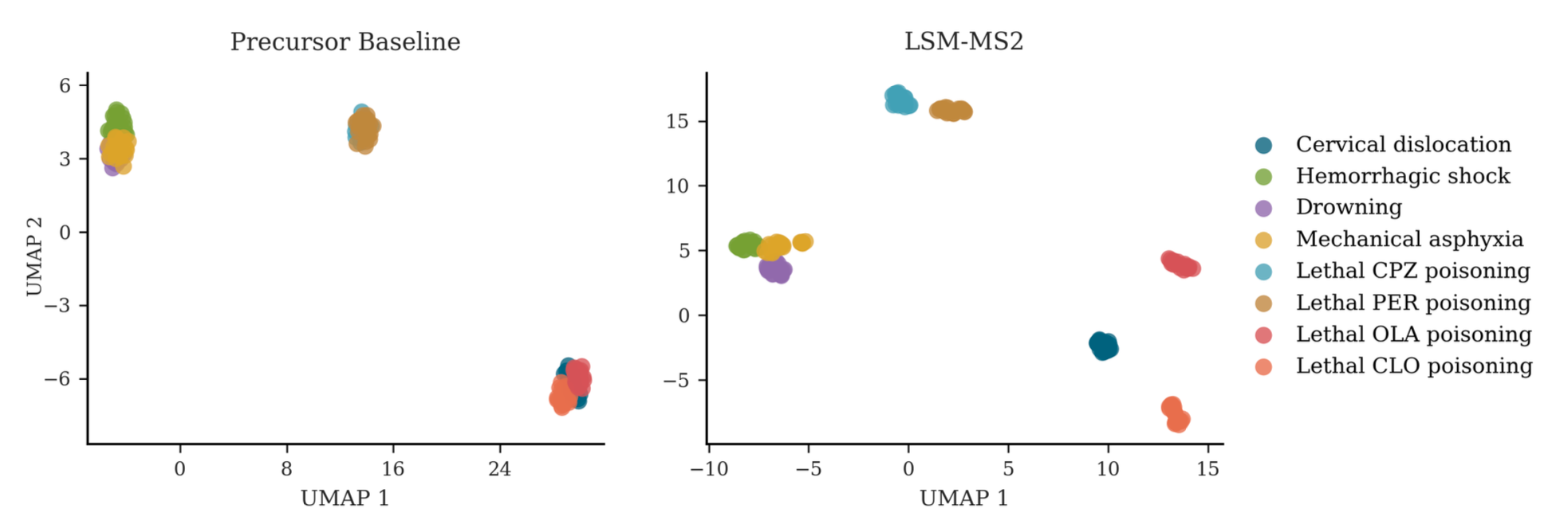 In contrast, clustering based on LSM-MS2 embeddings yields markedly improved resolution across all drug groups. Notably, samples corresponding to drowning, asphyxia, and hemorrhagic shock—conditions sharing hypoxic mechanisms—cluster closely together. These findings suggest that LSM-MS2 captures a more structured and biologically informative representation of metabolic variation than heuristic baselines.