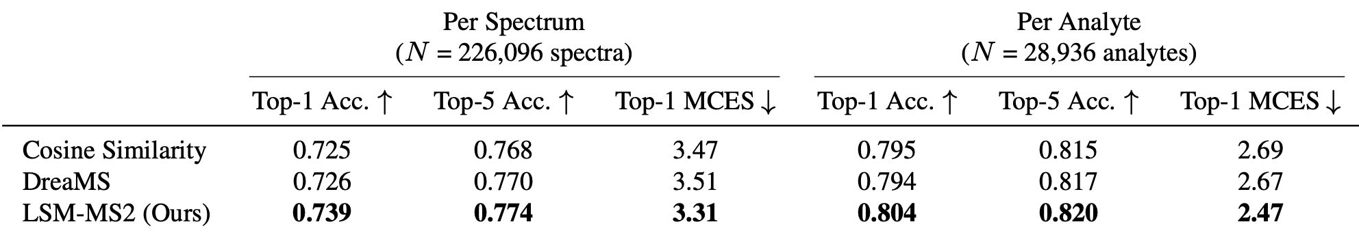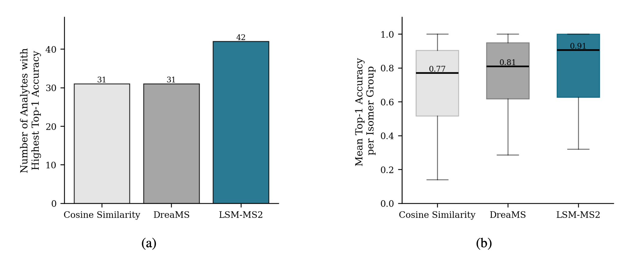 Despite using no explicit isomer-focused contrastive supervision during training, LSM-MS2 predicts nearly 30% more analytes with higher top-1 accuracy than both cosine similarity and DreaMS.