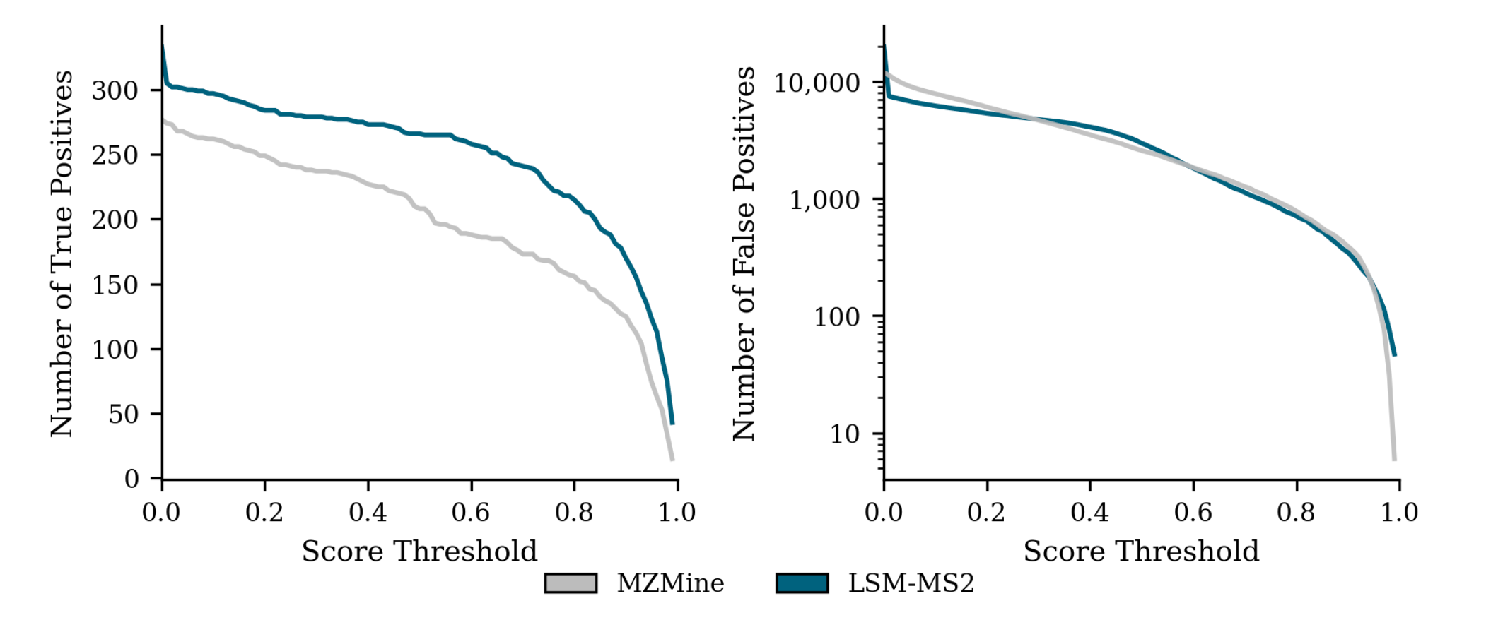 LSM-MS2 consistently outperforms MZmine at optimal score thresholds, retrieving 42.4% more true positive identifications and achieving 33.3% higher precision with no corresponding increase in false positives.