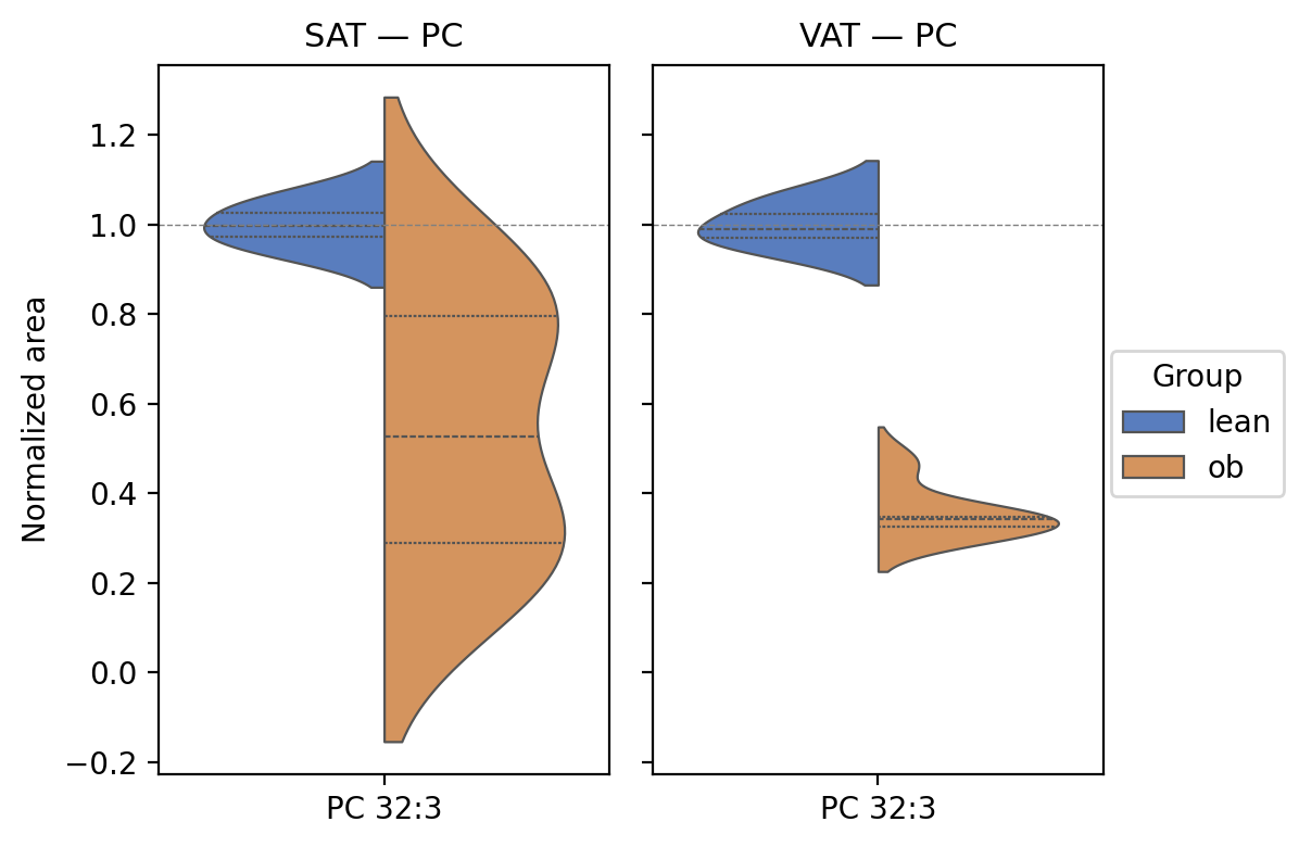 Per-sample abundance distributions for PC 32:3 in SAT and VAT, split by obese (orange) and lean (blue) groups. PC 32:3 was identified only by Pyxis and not reported in the original AdipoAtlas study, yet shows clear differential abundance between metabolic phenotypes, consistent with prior evidence linking this lipid to insulin resistance and obesity.